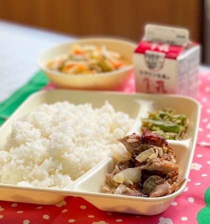 今日の献立は、ごはん、豚肉のしょうが焼き、とうふのみそ汁、じゃこピーマン、牛乳です。