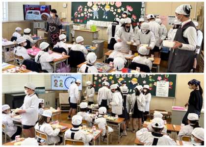 1年生の教室を覗いてみると、6年生が1年生の給食準備のお手伝いをしてくれていました。6年生の子どもたちは、1年生のお世話をとてもよくがんばってくれています。1年生の子どもたちも、6年生のお兄さん、お姉さんがお世話してくれるのでとても嬉しそうです。