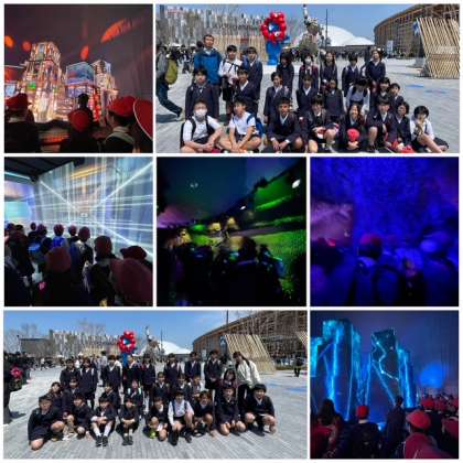 6年生は、招待されたパビリオン「PASONA NATUREVERSE」を見学して、ミャクミャク像・実物大ガンダム前で記念撮影をしました。