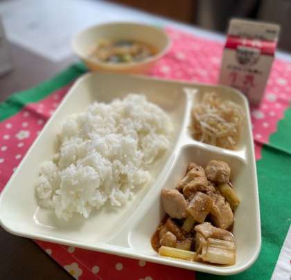 4/14の献立は、焼きとり、みそ汁、もやしのゆずの香あえ、ごはん、牛乳です。