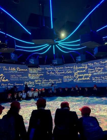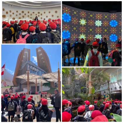 3年生は、インドネシアのパビリオンに来ました。各国のパビリオンは、その国の他特徴を活かした外観にも目を奪われます。内部に入ると、文化や自然にも触れることができ、子どもたちもその国に親近感を感じているようです。子どもたちは大興奮!とても楽しんでいます。