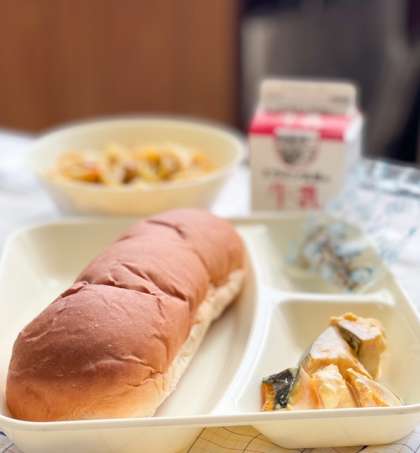 今日の献立は、黒糖パン、牛乳、カレースープスパゲッティ、かぼちゃのマリネ焼き、ミニフィッシュです。