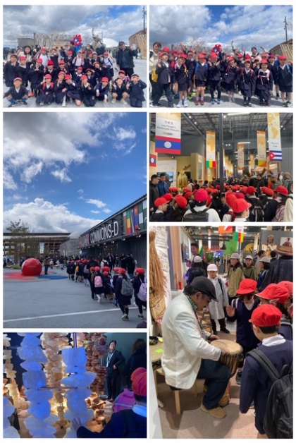 万博会場には、いろいろな国が集まって展示を行なっているコモンズというパビリオンがあります。各コーナーは小さめですが、1カ所でいろんな国の文化を知ることができます。3年生は、記念撮影を済ませ、コモンズDへ。