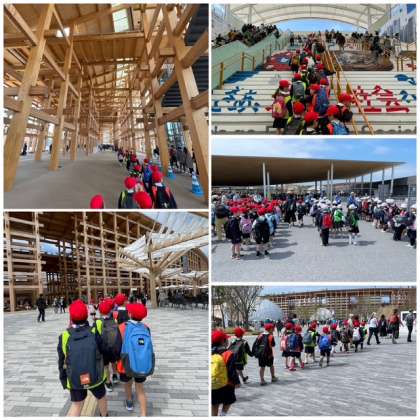 大屋根リングを見た子どもたちは、すごいなぁ、大きいなぁと感想を呟いていました。
