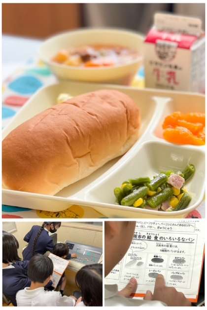 給食の時間に、給食委員会が献立や学校給食の豆知識を紹介してくれています。今日のお話は「パンの種類」の紹介。大阪市の学校給食では、コッペパン(ミニコッペパン)、黒糖パン、おさつパン、レーズンパン、パンプキンパンが提供されています。
