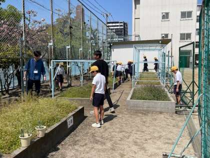 5年生は、学習園で理科の学習をしていました。アブラナの花のつくりがどのようになっているかを学習し、その他の花も同じような構造になっているのかを調べにきました。理科は、子どもたちが実際に自分の目で見て気づくことがとても大切です。チューリップや桜など、今咲いている花とアブラナを比べて、構造の違いに気づくことができました。