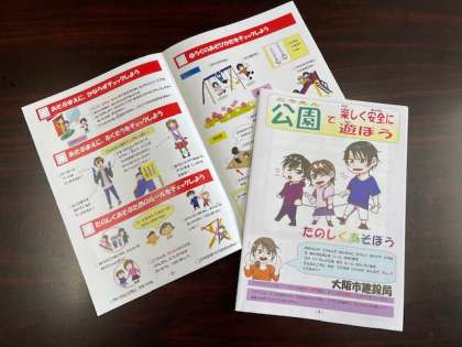 大阪市建設局より「公園で楽しく安全に遊ぼう」というパンフレットが配布されています。子どもたちが事故やトラブルに巻き込まれないために必要なことがうまくまとめられています。