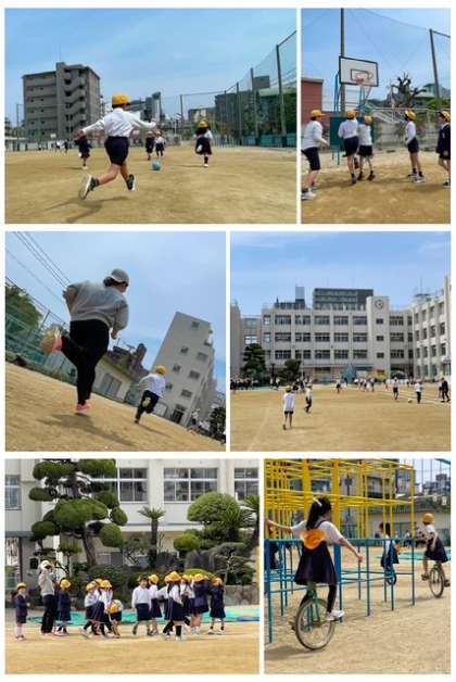 昼休み、運動場でたくさんの子どもたちが遊んでいました。今日13時の気温は23度。ここへ来て、急に暑い日が増えてきていますが、子どもたちは暑さに負けず元気に遊んでいます。ドッジボールやバスケットボール、一輪車やおにごっこなど、思い思いに体を動かして遊んでいます。