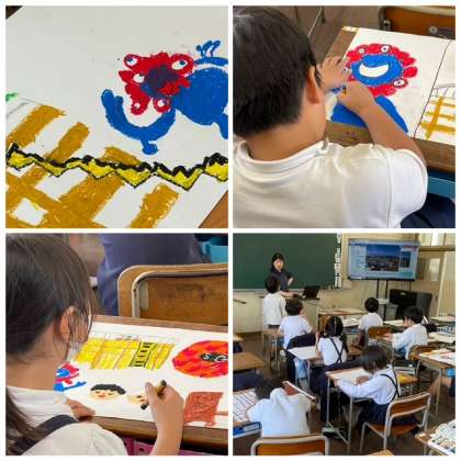 3年生が、図工の時間に「万博の思い出」を絵に描いていました。ミャクミャクと大屋根リングの存在感はさすがで、ほとんどの子が描いていますが、3年生にもなると入場したパビリオンのこともしっかり覚えているようで、パビリオンの外観を描いている子もいました。万博への参加は、子どもたちにとってとても楽しい思い出になったようです。