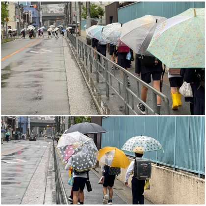 傘によって歩道が歩きにくくなるため、子どもたちが慌てずに登校できることは、安全面からも大切なことです。普段から早めの時間に子どもたちを送り出していただき、8時15分ごろにはほとんどの児童が正門を通っています。これが雨の日も子どもたちが焦らず登校できることに繋がっています。ご家庭でも毎朝の送り出し、ありがとうございます。
