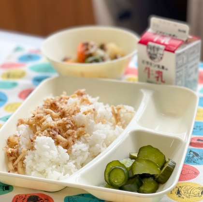 今日の献立は、ごはん、肉じゃが、きゅうりの酢のもの、ごまかかいため、牛乳です。