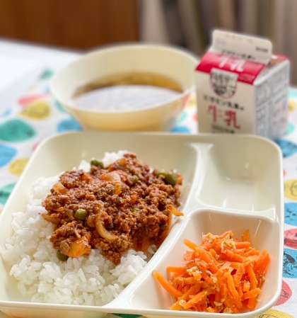 今日の献立は、タコライス、とうふともずくのとろり汁、にんじんしりしり風、牛乳でした。今日は沖縄料理の献立です。