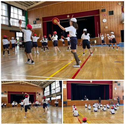 4年生は、講堂でエイサーの練習をしていました。みんな動きをよく覚えていて、とても上手です。太鼓の音がぴたりと合うと、とても迫力がありました。