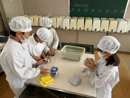 5年生の家庭科で、お茶を作りました。やかんで沸かしたお湯を、お茶っ葉を入れた急須に入れて、緑茶を作りました。緑茶にカステラを添えて、みんなで美味しくいただきました。