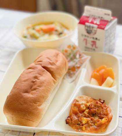 5/13の献立は、コッペパン、豚肉と野菜のカレースープ煮、変わりピザ、ミックスフルーツ(缶)、アプリコットジャム、牛乳です。