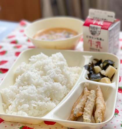 今日の献立は、ごはん、きびなごてんぷら、みそ汁、わかたけ煮、ごはん、牛乳です。