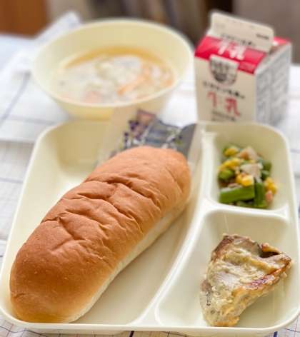 今日の献立は、コッペパン、かつおのガーリックマリネ焼き、押麦のスープ、グリーンアスパラガスのソテー、ブルーベリージャム、牛乳です。