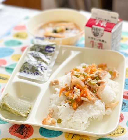 今日の献立は、かやくごはん、みそ汁、まっ茶ういろう、牛乳です。かやくごはんは、鶏肉、さんどまめ、にんじん、ちくわでできた具をご飯に混ぜ合わせ、きざみのりをふりかけていただきます。だし昆布、削り節でだしをとり、砂糖、みりん、塩、しょうゆで味付けした具材の味がごはん染み渡り、とても美味しいです。デザートのまっ茶ういろうも子どもたちに人気です。