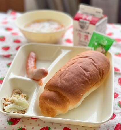 今日の献立は、コッペパン、ウインナーのケチャップソース、スープ、焼きツナキャベツ、ソフトマーガリン、牛乳です。