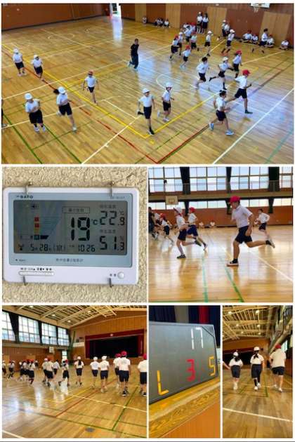 6年生は、シャトルランの測定を行いました。20m間隔の往復を何回続けられるかを測定します。負荷がかかる運動のため、暑くなる前に終わらせておきたい種目。今日は気温23度、暑さ指数19度と、この時期としては過ごしやすい気候でした。少しでもよい記録を出そうとがんばる姿、結果に満足できずもう一度チャレンジしたいと悔しさを滲ませる姿、子どもたちが意欲的に取り組んでいる様子がその姿から窺い知れます。