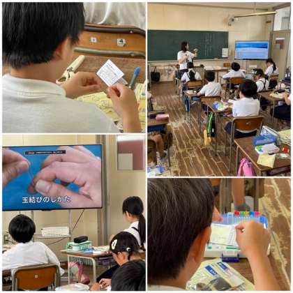 5年生は、裁縫の導入段階の「玉結び」の学習をしていました。動画を見ながら糸を結び、布を縫う練習をします。とても集中して取り組んでいました。