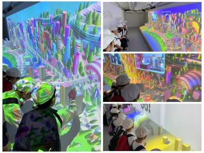 アトラクションは、各クラスを2グループに分けて、10人ぐらいの小グループで回りました。1つ目のアトラクションは「ニューワールドシアター」。未来の大阪を、模型とプロジェクションマッピングで表現しています。