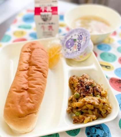 今日の献立は、コッペパン、カレーマカロニグラタン、てぼ豆のスープ、ぶどうゼリー、マーマレードでした。