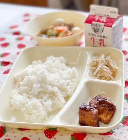 今日の献立は、ごはん、八宝菜、あつあげの中華みそだれかけ、もやしの中華あえ、牛乳です。