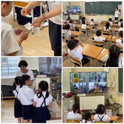 1年生は6月12日(木)に学校探検を予定しています。そこでは、いろいろな人に名刺を渡して自己紹介をして、相手のお仕事について聞く予定です。今日はその事前学習をしていました。学校のことをいろいろ聞き出すために、しっかりご挨拶できるように練習しています。