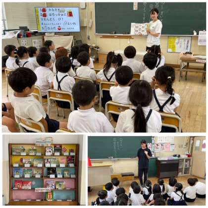 わくわくお話プレゼントで紹介した本は、職員室横の廊下の突き当たりにも展示しています。子どもたちが本に興味を深めてもらえればいいなと願い、この取り組みを続けています。