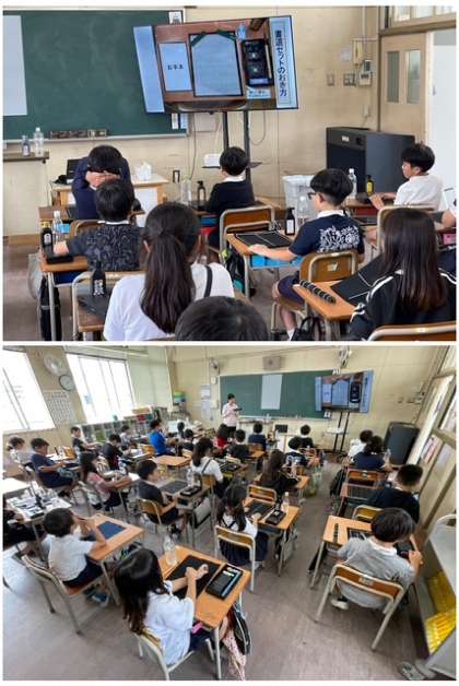 3年生は習字の学習をしていました。最初なので、どこにどのように道具を置くかということから丁寧に説明を聞きました。毛筆は鉛筆と全く異なる感覚なので、3年生の間に筆の使い方にしっかり慣れておきたいですね。
