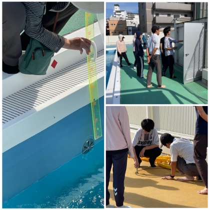 昨日の放課後、来週のプール開きに向けて、準備物や水位の確認、水質を保つための濾過機の操作方法等を教員が確認しました。
