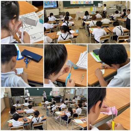 1年生は、七夕飾りを作っていました。ハサミで切り取って折り紙を開くと、いろいろな幾何学模様が生まれます。線対称な図形についての学習はずっと先ですが、こうした体験的な活動が子どもたちの図形感覚を育てます。綺麗な飾りがたくさんできました。