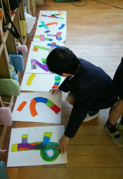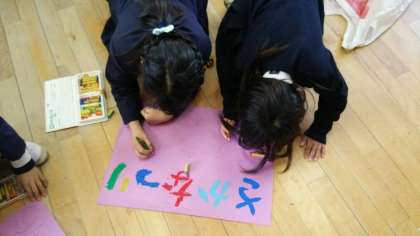 来週、幼稚園のお友だちが九条南小学校へやってきます。1年生は、いろいろな遊びを考えて準備を進めています。幼稚園のお友だちに上手に説明できるかなあ…。