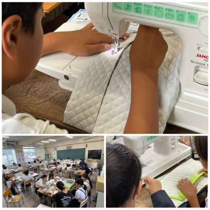6年生は、家庭科の時間にナップサックを作っています。教室にミシンを持ち込んで、みんなで教え合いながら取り組んでいました。完成したら、スポーツ交歓会や修学旅行など、校外に出かける行事で大活躍してくれそうです。