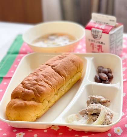 今日の献立は、パンプキンパン、豚肉のバジル焼き、鶏肉とキャベツのスープ、うずら豆のグラッセ、牛乳です。