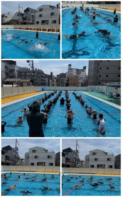 水慣れをした後、横でけ伸びやバタ足をして、泳力別に分かれてそれぞれの課題に取り組みました。タイム計測コース、25m挑戦コース、50m挑戦コース、クロールの形習得コースがあります。子ども達は意欲的に取り組んでいました。