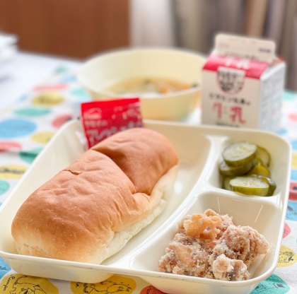 今日の献立は、コッペパン、鶏肉のからあげ、ハムととうがんの中華スープ、きゅうりのピリ辛あえ、牛乳です。