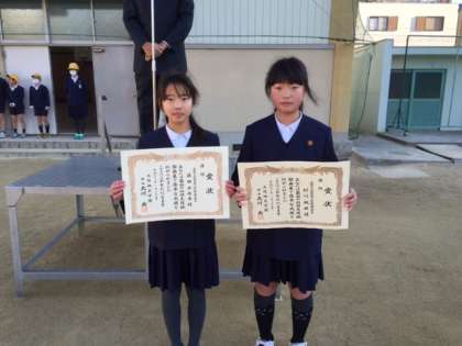 全校朝会で表彰され、全校児童から大きな拍手が起こりました。