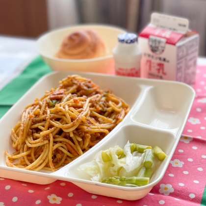 カレースパゲッティには、豚ひき肉、ベーコン、にんじん、たまねぎ、ピーマン、トマトが使われています。しっかり栄養を摂ることができる人気メニューです。