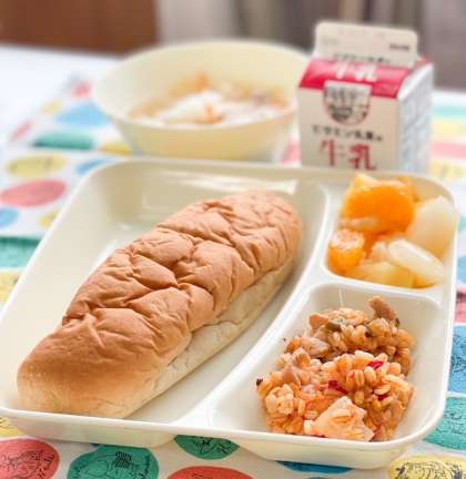 今日の献立は、黒糖パン、押麦のチキンパエリア、ウインナーとキャベツのスープ、ミックスフルーツ(缶)、牛乳です。