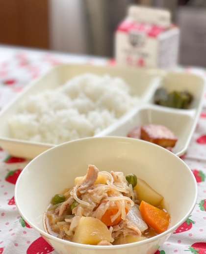 みそ肉じゃがは、豚肉とみそを使った肉じゃがです。ご飯がとても進む味付けです。今日も美味しくいただきます。
