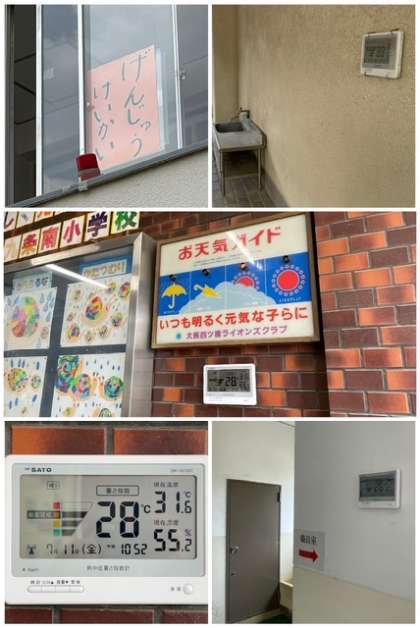 本校では、昨年度より暑さ指数計をピロティーに設置していましたが、同じ製品を玄関と職員室前に追加しました。これまで職員室前で使っていたポータブルの暑さ指数形は、暑さ指数計がない場所で使用します。