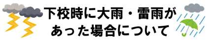 学校では、児童の下校時に雷雲が近づいている時や道路が冠水しかねないほどの大雨の場合に、児童の安全確保のために下校を遅らせる場合があります。下校を遅らせる場合は、ミマモルメでお知らせします。ご了解をいただきますようにお願いします。