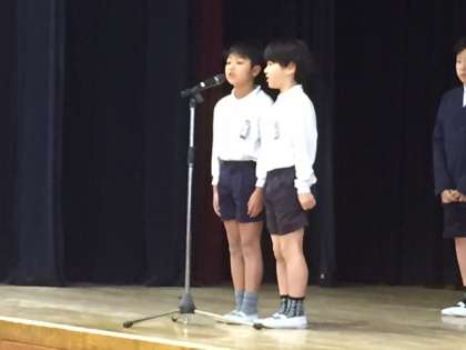 先日の児童朝会で3年生の「音読名人発表」がありました。