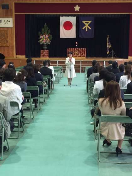 真新しい標準服に身を包み、式場に入場する姿は、まさにぴかぴかの1年生。1年生のみなさんは行儀もよく、静かにお話を聞くことができました。