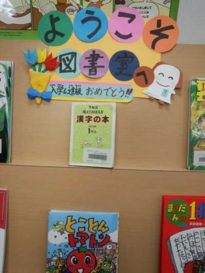図書室に「入学・進級おめでとう」コーナーを設置しています。