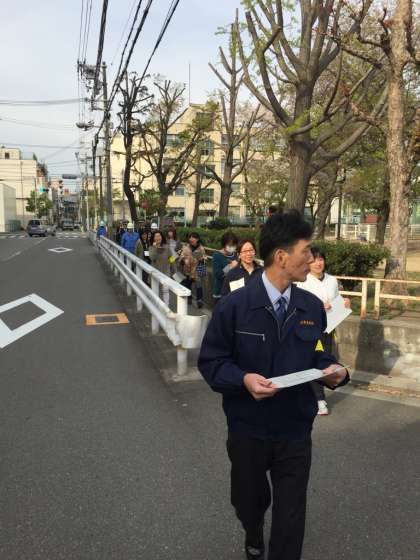 春の交通安全週間に合わせ、西警察署・西区役所・建設局工営所・保護者・学校が合同で、交通事故の未然防止のために校区安全点検巡視を実施しました。