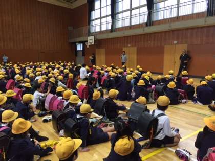 その後は、体育館に集まり、生活指導部長の濱本先生と校長先生の安全管理のお話を聞き、110番の家巡りにスタート。