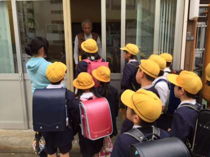 九条地域には子どもたちに危険が及びそうな時に助けていただける110番の家がたくさんあります。登校班ごとに地域の皆さんにお礼と今年度もお願いします。というご挨拶に回りました。